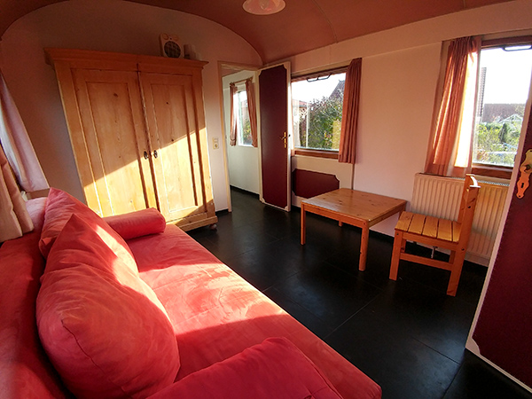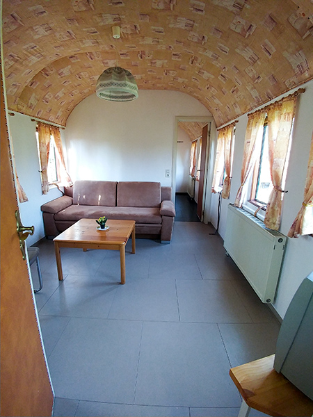 Typ A1: Für 2-4 Personen, ca. 30 qm. Zur Ferienwohnung umgestalteter Eisenbahnwaggon, alleinstehend oder als Doppelwaggon, jedoch immer mit sep. Eingang. Wohnraum mit Schlafcouch für 2 Personen und 1 Schlafraum mit 2 Betten oder Doppelbett.